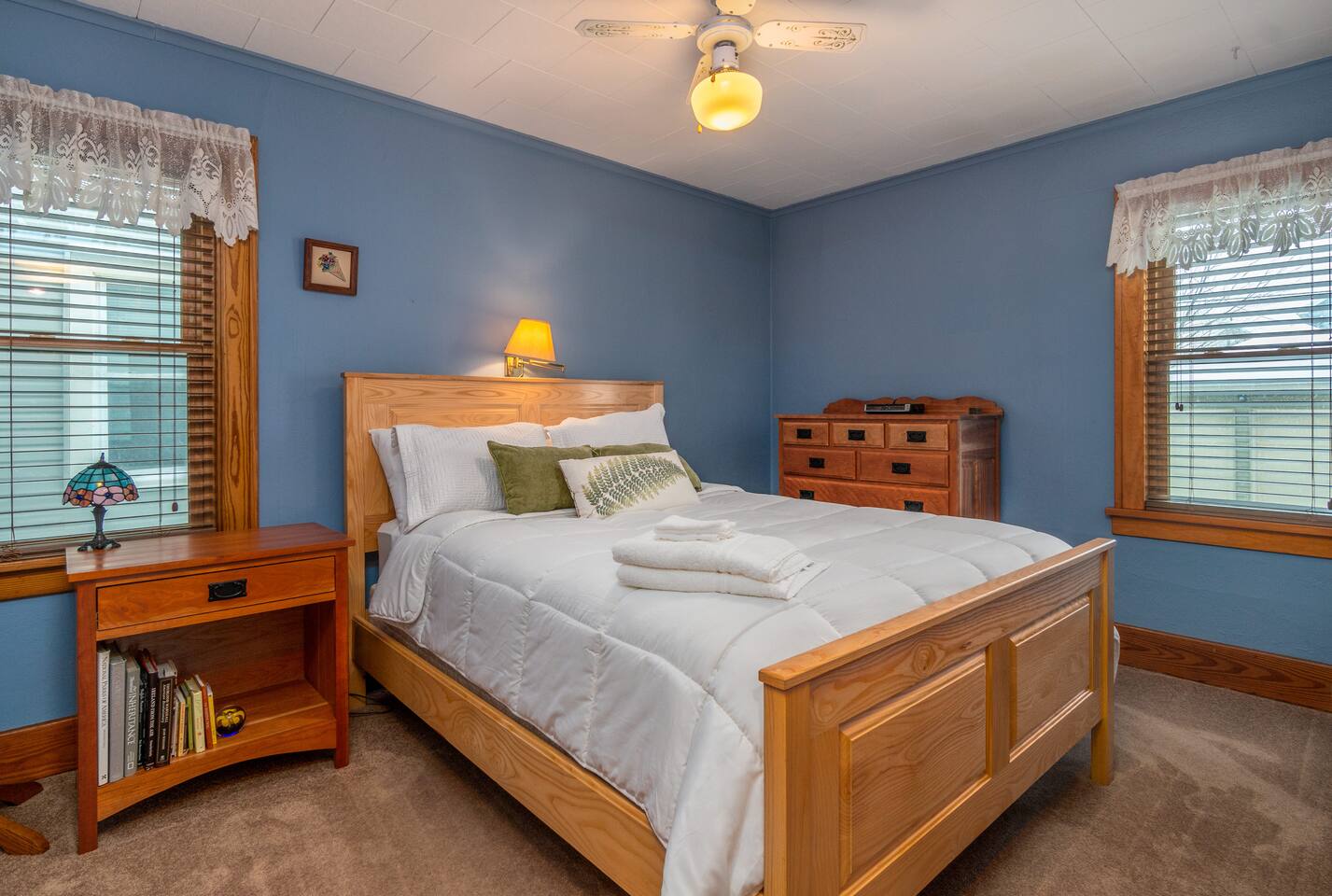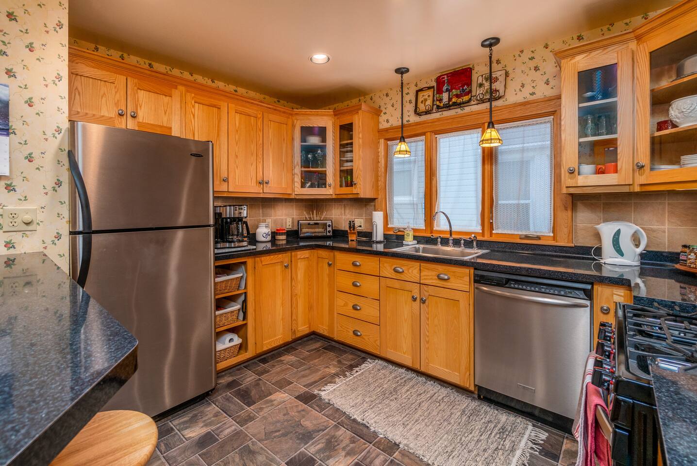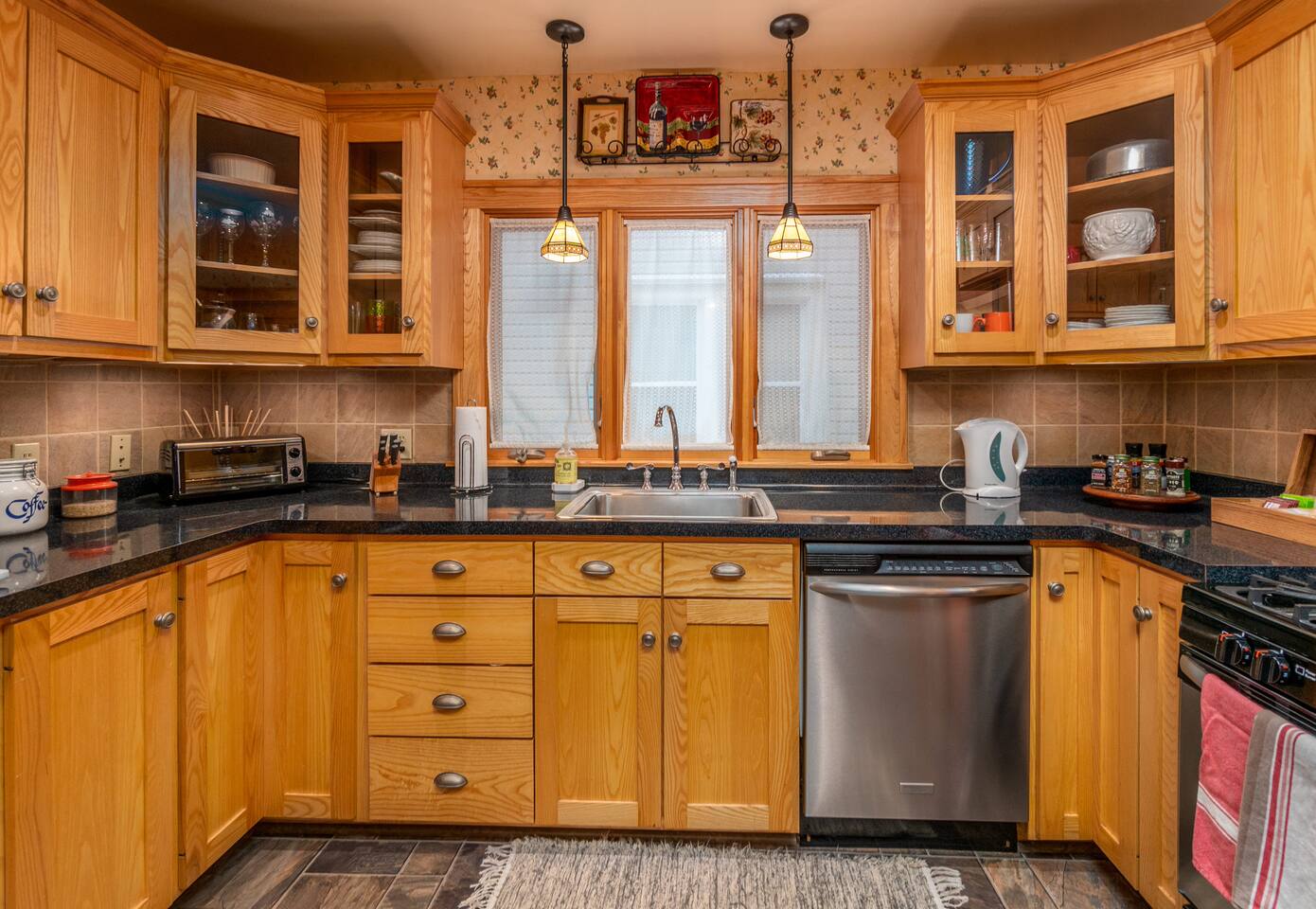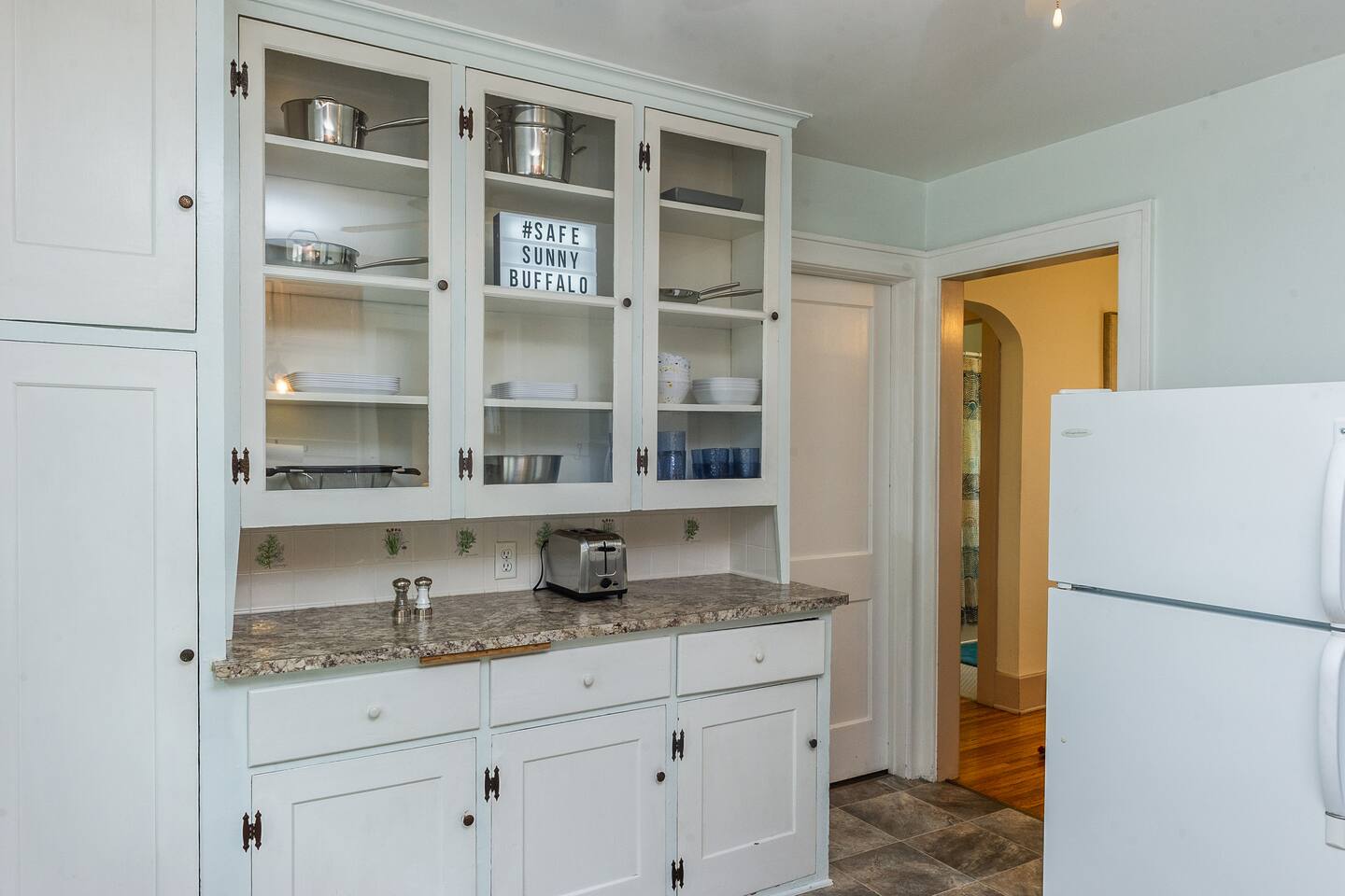 - Original glass door built-in kitchen cupboards on 2nd floor, custom Amish built cupboards on the 1st floor. - 2 Fully equipped kitchens with microwave, full-size refrigerators, freezers, toasters. - Large tubs with shower combination